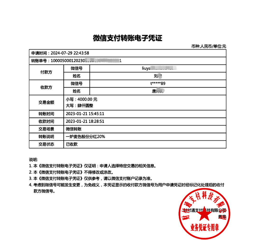 在该举报后面,网友附上了两张“微信支付转账电子凭证”显示,2023年1月21日,付款方刘某先后向唐某某及其好友李某某转账4000元,转账说明一栏写着:一炉麦色股份分红20%。