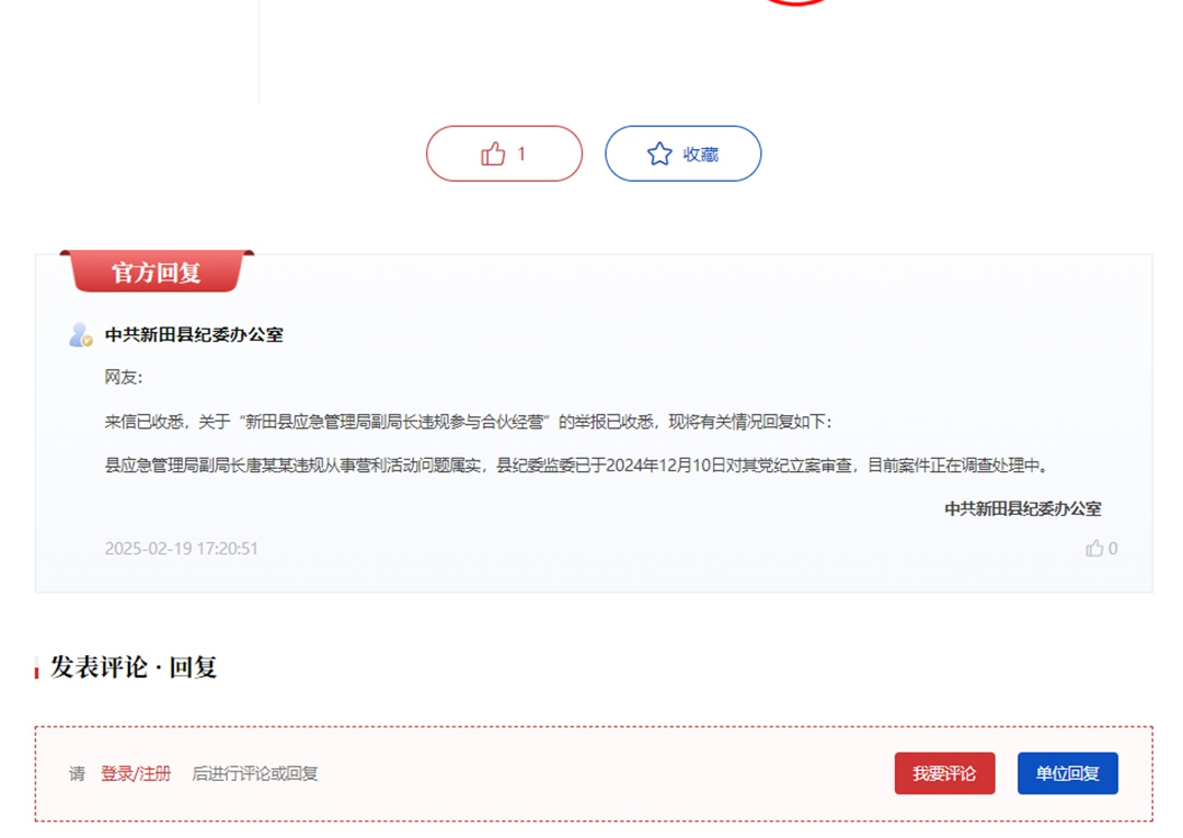 针对上述举报,中共新田县纪委办公室最新回复称,县应急管理局副局长唐某某违规从事营利活动问题属实,县纪委监委已于2024年12月10日对其党纪立案审查,目前案件正在调查处理中。