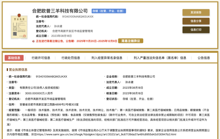 12月3日,界面新闻注意到,国家企业信用信息公示系统网站显示,合肥欧普三羊科技有限公司(以下简称“欧普三羊”)新增一条简易注销公告,公告期为11月20日至12月9日。