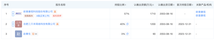 天眼查网站显示,欧普三羊法定代表人为孙永建,注册资本3000万人民币,经营范围包括第一类医疗器械销售、第二类医疗器械销售、日用品销售、化妆品零售等。股东信息表明,该公司由欧普康视、三只羊和赵春生共同持股。其中,欧普康视持股57%,三只羊持股40%,赵春生则持股3%。